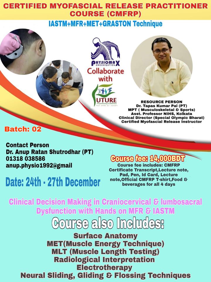7th Workshop CMFRP 24th -27th December , Bangladesh : Event Proposal: Physiomax Organisation,Kolkata in collaboration with Future Physiotherapy and wellness, Bangladesh going to organize Certified Myofascial Release practitioner Course from 24th -27th December 2019.This course is composed of Level 1 and Level 2 workshops for 4 days where the participants will be certified as CMFRP(Certified Myofascial … <