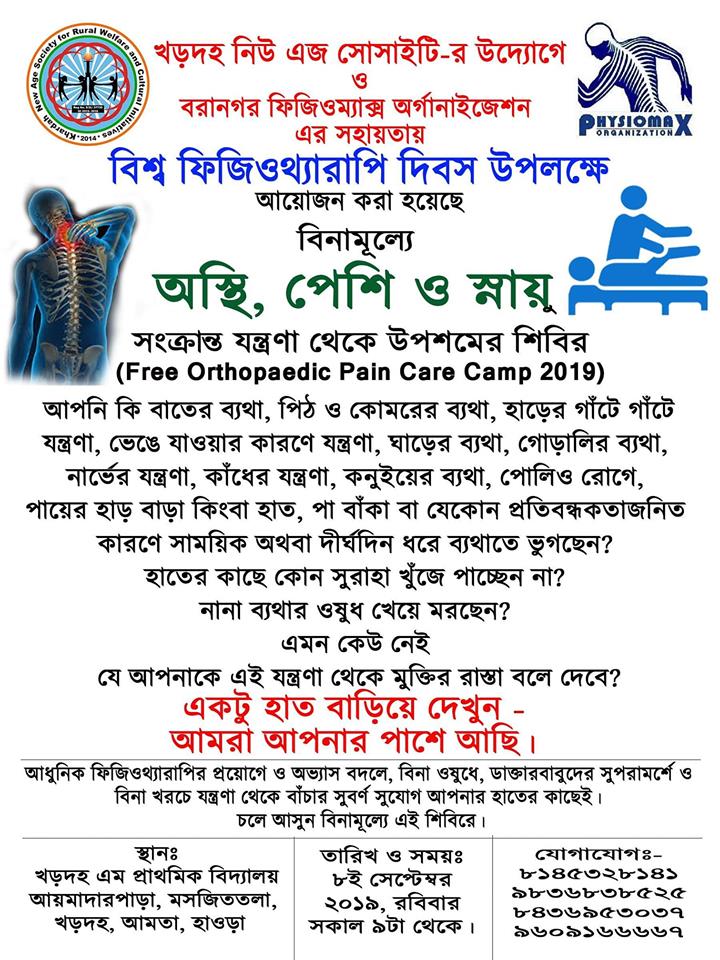 Event Proposal : খড়দহ নিউ এজ সোসাইটির উদ্যোগে ও বরানগর ফিজিওম্যাক্স অর্গানাইজেশন এর সহায়তায় একদিনের বিনামূল্যে অস্থি, পেশি ও স্নায়ু সংক্রান্ত যন্ত্রণা থেকে উপশমের শিব