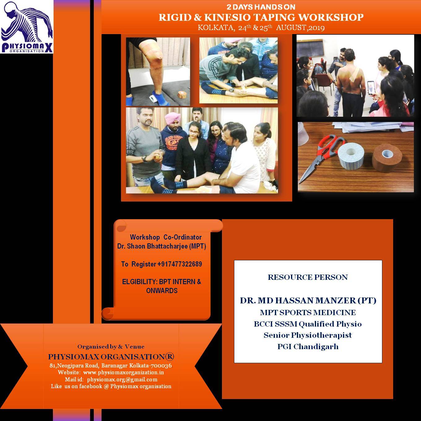 Event Proposal: Physiomax Organisation,Kolkata in collaboration with Expert Resource person on Taping going to organize Certified Kinesio and Rigid Taping workshop on 24th & 25 th August,2019. This workshop is composed 2 days hands on training where the participants will receive official valid contact hours . Maximum Participants: 20 Participants Qualification: Intern Phyio, BPT and onwards …
