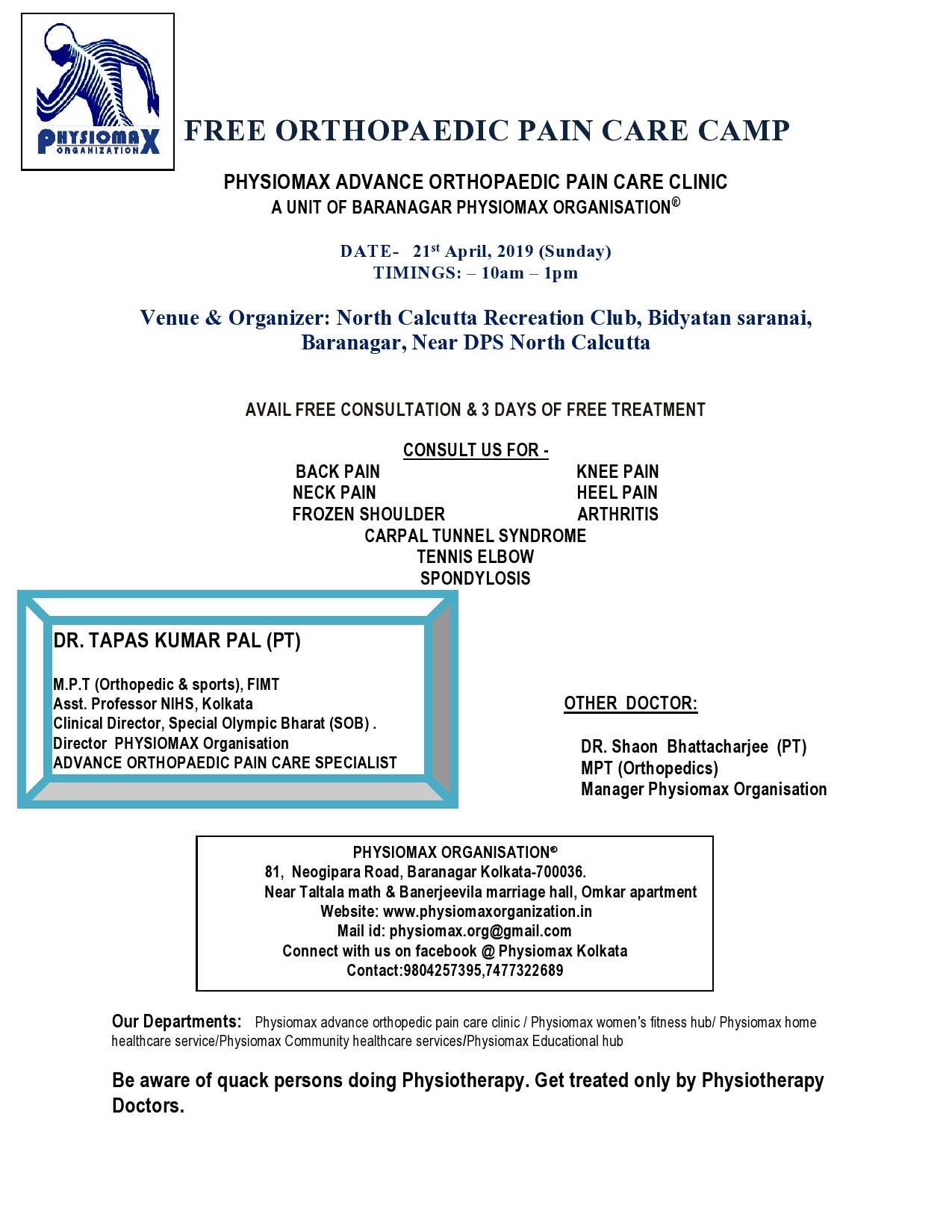 Baranagar Pain Care Camp: Event Proposal: Under the collaborative approach of Physiomax Organisation And North Calcutta Recreational Club it was decided to conduct a orthopedic pain care camp on 21.4.19 (Sunday) by 11 am to 1 pm at Bidyatan sarani near DPS north Calcutta. Physiomax Organisation team members will be visiting NCRC club office and …