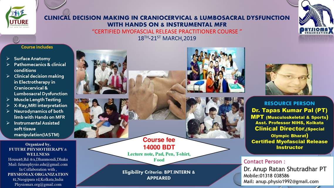 5th Workshop CMFRP 18th -21st March, Bangladesh : Event Proposal: Physiomax Organisation,Kolkata in collaboration with Future Physiotherapy and wellness, Bangladesh going to organize Certified Myofascial Release practitioner Course from 18th to 21st March,2019.This course is composed of Level 1 and Level 2 workshops for 4 days where the participants will be certified as CMFRP(Certified Myofascial …